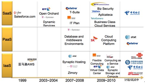 云計(jì)算的一個(gè)典型特征就是IT資源服務(wù)化,也就是將傳統(tǒng)的IT產(chǎn)品、能力通過(guò)互聯(lián)網(wǎng)以服務(wù)的形式交付給用戶。那么云計(jì)算主要包含哪些服務(wù)形式呢?通常的分類(lèi)方法是分為IaaS(Infrastructure as a Service,基礎(chǔ)設(shè)施即服務(wù))、PaaS(Platform as a Service,平臺(tái)即服務(wù))和SaaS(Software as aService,軟件即服務(wù)),基本對(duì)應(yīng)于傳統(tǒng)IT中的硬件、平臺(tái)和應(yīng)用軟件。從下圖2云計(jì)算領(lǐng)域企業(yè)動(dòng)態(tài)可知,目前大多數(shù)運(yùn)營(yíng)商主要最先從IaaS類(lèi)服務(wù)進(jìn)軍云計(jì)算。
