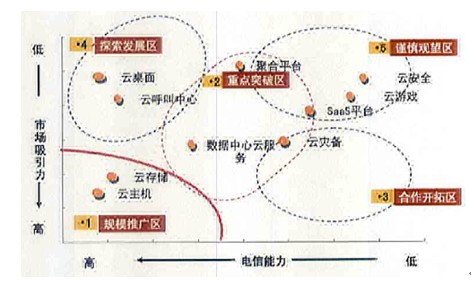 從具體服務(wù)形式上看,大多數(shù)運(yùn)營(yíng)商主要先大力發(fā)展云主機(jī)、云存儲(chǔ)服務(wù)等基礎(chǔ)設(shè)施IT服務(wù),并將數(shù)據(jù)中心云服務(wù)作為重點(diǎn)突破區(qū),對(duì)于云桌面、云呼叫中心、云災(zāi)備、云游戲、云安全等往往采取保守市場(chǎng)策略,具體見(jiàn)下圖3運(yùn)營(yíng)商云計(jì)算產(chǎn)品發(fā)展策略示意圖