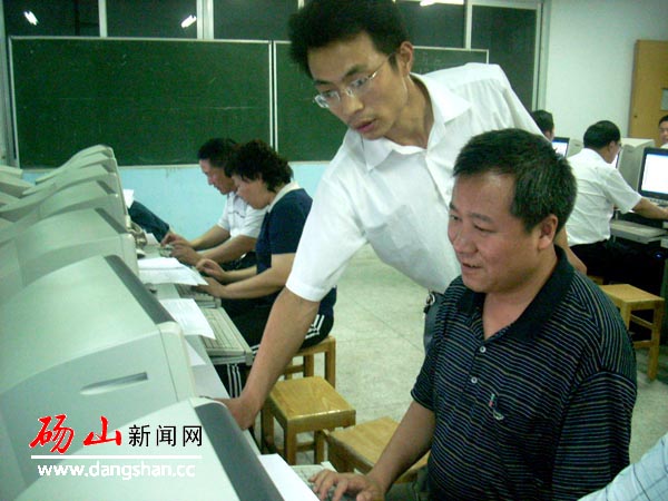 5月27日晚7:00,碭山中學一名教師在為縣委書記張祥根進行計算機網絡知識輔導。從5月27日起,由縣委宣傳部組織舉辦的縣四大班子領導,縣直各單位主要負責人,各鎮(zhèn)及開發(fā)區(qū)負責人電子政務培訓班,擬利用每晚兩個小時的時間,通過一個月的學習培訓,使碭山縣電子政務得到有效推動。全縣100多名正科級以上干部將通過對計算機辦公自動化、網絡基礎知識和應用、計算機安全與管理及其實際運用操作,強化運用信息技術與資源的能力,提高推進電子政務工作的水平和實際應用能力。