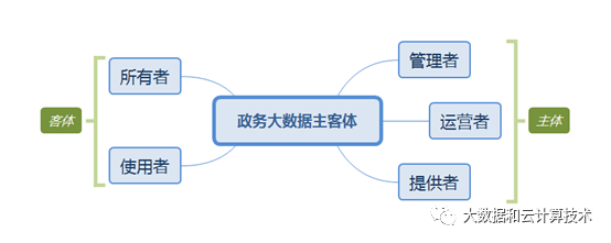 政務(wù)大數(shù)據(jù)的主客體,在類型上可以分為管理者、運(yùn)營(yíng)者、提供者、所有者和使用者。其中,管理者、運(yùn)營(yíng)者和提供者是廣義的服務(wù)提供者,是主體;所有者和使用者是廣義的服務(wù)使用者(被服務(wù)對(duì)象),是客體。主體和客體都是政務(wù)大數(shù)據(jù)服務(wù)的參與者,它們之間是服務(wù)與被服務(wù)的關(guān)系。在實(shí)際環(huán)境下,同一個(gè)主體或客體,往往具有管理者、運(yùn)營(yíng)者、提供者、所有者和使用者中兩個(gè)或兩個(gè)以上的多重角色。在本文中,重點(diǎn)從政務(wù)大數(shù)據(jù)服務(wù)的參與者來(lái)分析其主客體及相互關(guān)系。