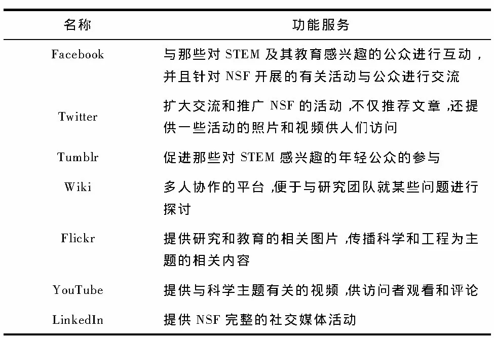 社交媒體是人們彼此之間分享意見和觀點(diǎn)的工具和平臺,現(xiàn)階段的社交媒體主要包括各種社交網(wǎng)站、微博、微信、博客、論壇等。利用社交媒體技術(shù)可以推動政府與公眾的對話,并為社會各方討論政府政策制定和實(shí)施提供機(jī)會,促進(jìn)官民合作。以白宮的“we the people”請?jiān)妇W(wǎng)為例,該平臺為公眾聯(lián)合發(fā)起政策議題、參與聯(lián)邦政府政策的制定提供了重要途徑。美國國家科學(xué)基金會(The National Science Foundation,NSF)為促進(jìn)公眾參與的多元化,加強(qiáng)政府與公眾的溝通協(xié)作,構(gòu)建了多種社交媒體網(wǎng)站(見表2)。這些社交媒體工具極大地促進(jìn)了公眾的參與。