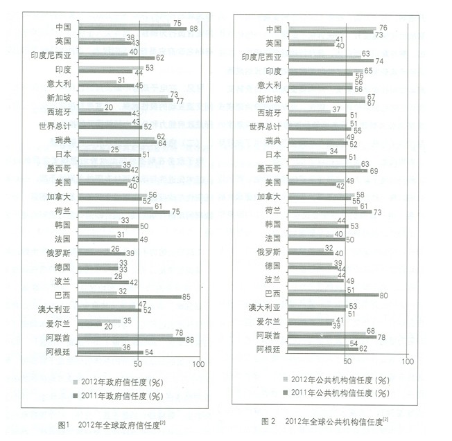 美國愛德曼公關公司2012年的全球政府信任調(diào)查顯在被調(diào)查的25個國家和地區(qū)中,只有阿聯(lián)酋、中國、新加坡、瑞典、荷蘭、加拿大等6個國家公眾對政府的信任度超過50%。與2011年相比(2011年調(diào)查了23個國家和地區(qū),2012年調(diào)查了25個國家和地區(qū)),23個國家和地區(qū)的公眾對政府的總體信任度呈下降態(tài)勢,降幅為9個百分點,具體而言,有4個國家和地區(qū)的的公眾對政府的信任度呈上升態(tài)勢、1個呈持平狀態(tài)、18個呈下降態(tài)勢,降幅最大的是巴西。另外,23個國家和地區(qū)的公眾對公共機構的總體信任度也呈下降態(tài)勢,降幅為4個百分點,具體而言,有7個呈上升態(tài)勢,2個呈持平狀態(tài),15個呈下降態(tài)勢(參見圖1、圖2)。