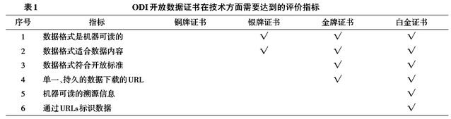 ODM的子項(xiàng)目,英國(guó)開(kāi)放數(shù)據(jù)研究所(Open Data Institute,ODI)開(kāi)發(fā)和維護(hù)的在線工具“開(kāi)放數(shù)據(jù)證書”(certificates.theodi.org),則是通過(guò)收集每個(gè)數(shù)據(jù)集的DCAT(Data Catalog Vocabulary)元數(shù)據(jù)評(píng)價(jià)其質(zhì)量和可信度,評(píng)價(jià)結(jié)果從低到高分為四類證書:銅牌、銀牌、金牌和白金證書。項(xiàng)目考察開(kāi)放數(shù)據(jù)集的法律、技術(shù)、社會(huì)和實(shí)踐四個(gè)方面的23個(gè)指標(biāo),“機(jī)器可讀的溯源信息”是技術(shù)方面的6個(gè)指標(biāo)之一,見(jiàn)表1。級(jí)別越高要求達(dá)到的指標(biāo)越多,“溯源”是最高級(jí)別的“白金證書”所必需的。