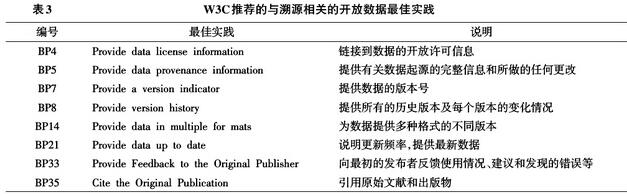 2016年8月30日,DWBP工作組的主要成果——在Web中發(fā)布數(shù)據(jù)的最佳實(shí)踐,成為W3C的候選標(biāo)準(zhǔn)[15]。工作組為開(kāi)放數(shù)據(jù)推薦了35個(gè)最佳實(shí)踐(Best Practice,BP),其中19個(gè)有助于提升數(shù)據(jù)的可信度,而與溯源相關(guān)的最佳實(shí)踐有8個(gè),見(jiàn)表3。