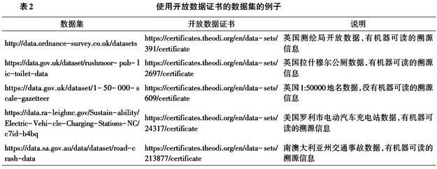 2013年11月1日頒布的《G8開(kāi)放數(shù)據(jù)憲章英國(guó)國(guó)家行動(dòng)計(jì)劃》規(guī)定NⅡ中的開(kāi)放數(shù)據(jù)集要經(jīng)歷“開(kāi)放數(shù)據(jù)證書”的評(píng)估過(guò)程。美國(guó)和澳大利亞等國(guó)的開(kāi)放數(shù)據(jù)門戶網(wǎng)站也采納了這項(xiàng)評(píng)估,用以向用戶推薦數(shù)據(jù)集。表2給出了來(lái)自三個(gè)國(guó)家的5個(gè)數(shù)據(jù)集的例子,它們均是銀牌證書,其中4個(gè)有機(jī)器可讀的溯源信息,1個(gè)沒(méi)有。