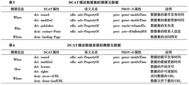 綜合表5和表6,DCAT中的溯源信息涵蓋四個(gè)方面:When、Who、Where和How。同DC中的溯源信息相比[8],多了Where方面的三個(gè)元數(shù)據(jù)項(xiàng),滿足了開(kāi)放數(shù)據(jù)“到哪里找到數(shù)據(jù)”的需求。