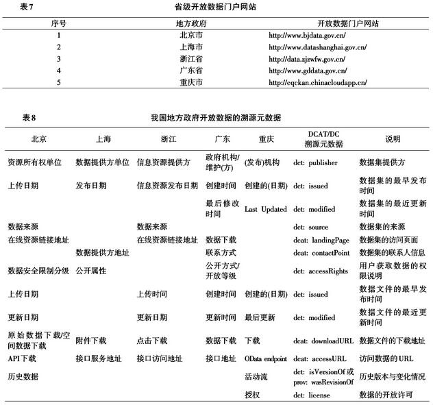 3.1 現(xiàn)有的溯源元數(shù)據(jù) 首先,通過(guò)對(duì)代表性的5個(gè)省級(jí)網(wǎng)站(見(jiàn)表7)的調(diào)研,依據(jù)DCAT和DC元數(shù)據(jù)標(biāo)準(zhǔn)規(guī)范,提煉和總結(jié)出現(xiàn)有的溯源元數(shù)據(jù),見(jiàn)表8。其他元數(shù)據(jù)項(xiàng)主要是描述型的,如資源名稱、摘要、分類、關(guān)鍵字、文件名和文件大小等,未列在表8中。