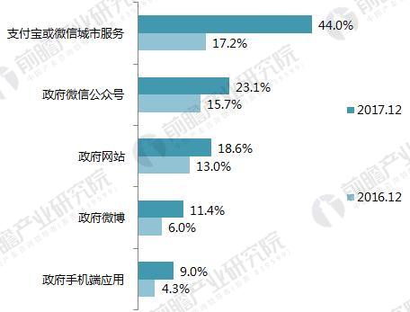 截至2017年底,我國在線政務服務用戶規(guī)模達到4.85億,占總體網(wǎng)民的62.9%。其中,通過支付寶或微信城市服務平臺獲得政務服務的使用率為44%,為網(wǎng)民使用最多的在線政務服務方式,較2016年底增長26.8個百分點;其次為政府微信公眾號,使用率為23.1%,政府網(wǎng)站、政府微博及政府手機端應用的使用率分別為18.6%、11.4%和9%。
