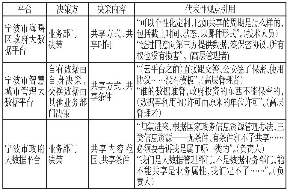 上述分析表明, 與現(xiàn)有文獻研究的主流觀點相反, 政府跨部門數(shù)據(jù)共享的影響因素眾多, 但由于存在業(yè)務(wù)需求, 各業(yè)務(wù)部門對數(shù)據(jù)共享表示支持, 而非各部門不愿共享數(shù)據(jù)。同時寧波市三個跨系統(tǒng)跨部門的政府大數(shù)據(jù)平臺數(shù)據(jù)共享的經(jīng)驗揭示, 將數(shù)據(jù)共享的決策權(quán)保留在業(yè)務(wù)部門, 以減少業(yè)務(wù)部門數(shù)據(jù)共享的顧慮是有效的大數(shù)據(jù)平臺數(shù)據(jù)共享路徑。