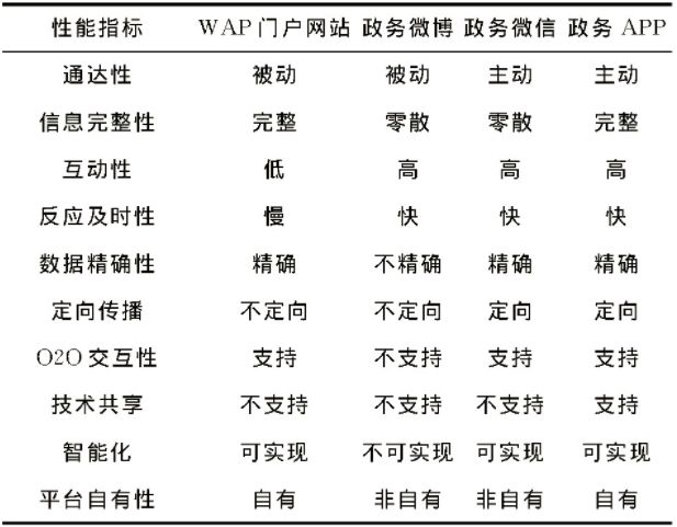 綜合學(xué)界對于移動政務(wù)平臺研究的學(xué)術(shù)觀點,結(jié)合費軍等人政務(wù)平臺實用性研究成果,以WAP門戶網(wǎng)站、政務(wù)微博、政務(wù)微信、政務(wù)APP為代表來對比分析各政務(wù)平臺的性能特點。我們綜合選取了10種共3類性能指標(biāo),即基本服務(wù)功能要求指標(biāo)(通達性、信息完整性、互動性、反應(yīng)及時性)、智能化服務(wù)性能指標(biāo)(數(shù)據(jù)精確性、定向傳播、O2O交互性)、擴展服務(wù)性能指標(biāo)(技術(shù)共享、智能化、平臺自有性)來進行對比,以此展示各移動政務(wù)平臺的性能(見表1)。