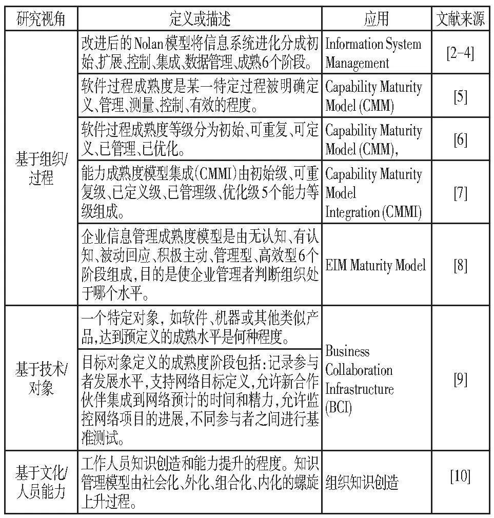 成熟度通常指特定能力從最初到期望達(dá)到目標(biāo)的過(guò)程中的演化進(jìn)度。成熟度模型是一種對(duì)關(guān)注領(lǐng)域進(jìn)行評(píng)估的工具和持續(xù)改進(jìn)的方法, 用于把成熟度要素分成若干不同階段, 評(píng)估領(lǐng)域現(xiàn)狀和所處發(fā)展階段。目前成熟度模型主要分為組織、技術(shù)、文化三類視角, 現(xiàn)將不同領(lǐng)域視角下的成熟度模型定義、描述與應(yīng)用進(jìn)行簡(jiǎn)單梳理, 如表1所示。