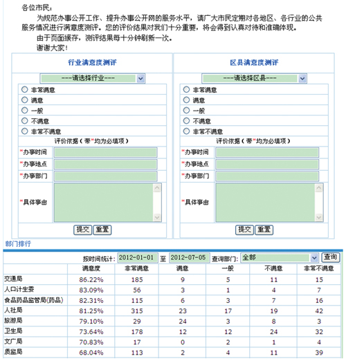 市民還可以對各行業(yè)和各地區(qū)辦事公開工作和日常辦事服務(wù)情況進行滿意測評,測評結(jié)果由系統(tǒng)直接記錄并運行計算,滿意度數(shù)值在網(wǎng)站首頁顯著位置實時排行,通過“曬出”百姓的直接評價結(jié)果,建立起各單位的自我監(jiān)管和約束機制。