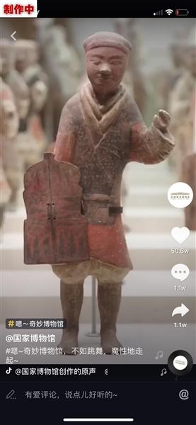 國博發(fā)布的短視頻中,“高冷”的陶男俑、陶女俑和說書俑在音樂中“跳起舞來”。手機(jī)APP截圖