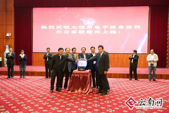 省人民政府尹建業(yè)副省長、楊斌副秘書長、大理州委梁志敏書記、何華州長、中國移動云南公司馬奎總經(jīng)理一起手觸水晶球,共同啟動了大理州電子政務協(xié)同辦公系統(tǒng)。