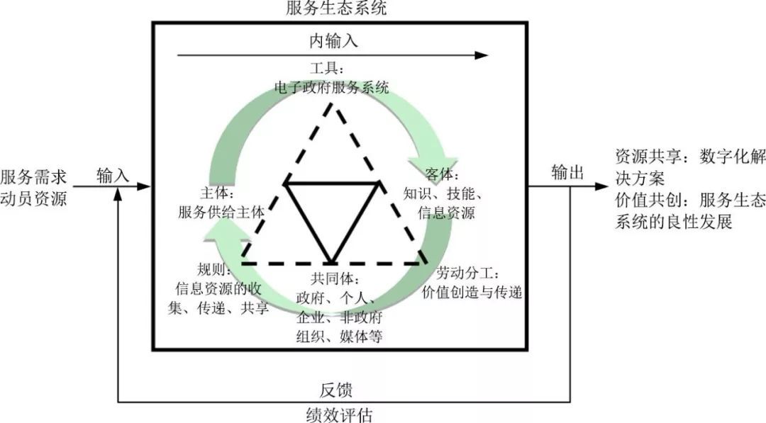 政治—行政系統(tǒng)是Torfing J等在吸收Stephen P O等觀點后提出的新公共服務(wù)關(guān)鍵要素的分析框架, 闡明了從輸入服務(wù)需求和動員參與的資源, 到服務(wù)決策過程 (內(nèi)輸入) 中的角色、價值、規(guī)范和程序, 進(jìn)而輸出政策、管制和公共服務(wù), 并在規(guī)范標(biāo)準(zhǔn)基礎(chǔ)上進(jìn)行服務(wù)績效評估和反饋的邏輯;提倡通過網(wǎng)絡(luò)結(jié)構(gòu)和伙伴關(guān)系來促進(jìn)公共利益與私人利益相關(guān)者的互動合作, 以便交換和共享公、私部門的資源, 建立共同所有的解決方案。由此可見, 政治—行政系統(tǒng)遵循服務(wù)主導(dǎo)邏輯?;顒永碚摦a(chǎn)生于黑格爾和康德的古典哲學(xué), 認(rèn)為人類活動的過程是人類個體、群體與所處環(huán)境之間雙向交互的過程, 為我們從多層次、多維度認(rèn)識電子政務(wù)服務(wù)的實踐活動提供了理論依據(jù)。結(jié)合活動理論研究電子政務(wù)服務(wù), 將有助于以用戶為中心的電子政府服務(wù)的系統(tǒng)構(gòu)建, 并便于考察服務(wù)生態(tài)系統(tǒng)中各關(guān)鍵要素之間的交互關(guān)系。