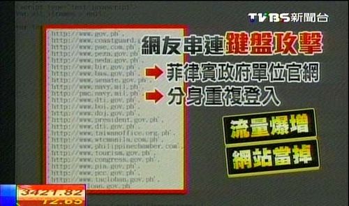 臺(tái)灣黑客正與菲律賓黑客在網(wǎng)絡(luò)上進(jìn)行攻防戰(zhàn),臺(tái)灣黑客首先在網(wǎng)絡(luò)上發(fā)起“鍵盤攻擊”活動(dòng),用人肉DDoS分散式阻斷服務(wù)攻擊,癱瘓了部分菲律賓政府網(wǎng)站(該活動(dòng)已停止,網(wǎng)址就不附了)。隨後臺(tái)灣幾個(gè)政府網(wǎng)站與數(shù)十個(gè)民間小網(wǎng)站也被菲律賓駭客反過來攻擊、入侵,臺(tái)灣與菲律賓之間的網(wǎng)戰(zhàn)隨即燃燒起來。
