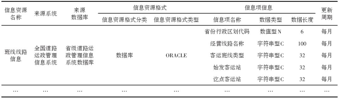 依托前期信息資源調(diào)研成果,編目人員可通過(guò)電子表格的形式直接進(jìn)行人工編目,或使用目錄系統(tǒng)進(jìn)行在線人工編目。此外,對(duì)于可直接訪問(wèn)其業(yè)務(wù)數(shù)據(jù)庫(kù)的信息資源,可通過(guò)目錄系統(tǒng)從數(shù)據(jù)庫(kù)中提取元數(shù)據(jù)特征信息,從而實(shí)現(xiàn)自動(dòng)編目。信息化部分編目,將完成對(duì)信息資源名稱、信息資源提供方、信息資源提供方代碼、來(lái)源系統(tǒng)、來(lái)源數(shù)據(jù)庫(kù)、信息資源格式、信息項(xiàng)屬性、更新周期等核心元數(shù)據(jù)的賦值,形成信息資源清單。以全國(guó)道路運(yùn)政管理信息系統(tǒng)為例,形成的信息資源清單如表4所示。