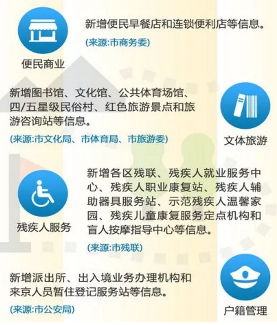 據(jù)介紹,新增的公開地圖內(nèi)容涉及教育資源、醫(yī)療衛(wèi)生機(jī)構(gòu)、社會保障服務(wù)、民政事務(wù)、便民商業(yè)網(wǎng)點(diǎn)、文體旅游、殘疾人服務(wù)、戶籍管理、交通管理等12類57幅,實(shí)現(xiàn)了862所公辦幼兒園、435家免疫規(guī)劃預(yù)防接種門診、1366個(gè)便民早餐店、470個(gè)殘疾人職業(yè)康復(fù)站、3064個(gè)來京人員暫住登記服務(wù)站、115個(gè)司法鑒定機(jī)構(gòu)、200個(gè)工商機(jī)構(gòu)等服務(wù)信息一站查詢、一覽無余。