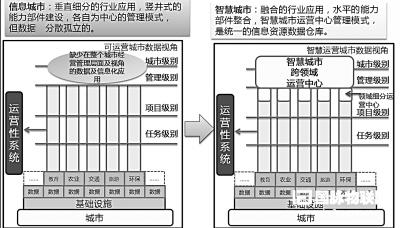 隨著城市人口的聚集,產(chǎn)業(yè)的升級發(fā)展,人們對生活質(zhì)量期望的提升,城市各行業(yè)領(lǐng)域都迫切地需求借助信息化手段提升社會管理效率和公共服務(wù)的能力。信息城市階段,城市各行業(yè)領(lǐng)域建立各自的信息化系統(tǒng),各行業(yè)信息化系統(tǒng)彼此獨立,信息資源沒有進(jìn)行有效的匯聚整合和共享。智慧城市階段就是通過增加跨行業(yè)領(lǐng)域的運營中心,匯集整個城市運營層面的數(shù)據(jù),將原有的行業(yè)信息化延展為社會信息化,并將社會管理納入統(tǒng)一系統(tǒng),為分析各行業(yè)領(lǐng)域相關(guān)性,實現(xiàn)智慧決策創(chuàng)造了條件。智慧城市相對信息城市來講,加強了各行業(yè)系統(tǒng)及數(shù)據(jù)之間的相關(guān)性,通過關(guān)聯(lián)關(guān)系挖掘新的價值,不再單純追求因果關(guān)系的分析。