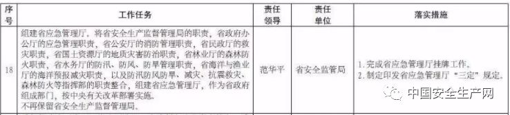 《改革方案》中將海南省安全生產(chǎn)監(jiān)督管理局的職責(zé),省政府辦公廳的應(yīng)急管理職責(zé),省公安廳的消防管理職責(zé),省民政廳的救災(zāi)職責(zé),省國土資源廳的地質(zhì)災(zāi)害防治職責(zé),省林業(yè)廳的森林防火職責(zé),省水務(wù)廳的防汛、防風(fēng)、防旱管理職責(zé),省海洋與漁業(yè)廳的海洋預(yù)報減災(zāi)職責(zé),以及防汛防風(fēng)防旱、減災(zāi)、抗震救災(zāi)、森林防火等指揮部的職責(zé)整合,組建省應(yīng)急管理廳,作為省政府組成部門,按中央有關(guān)改革部署實施。