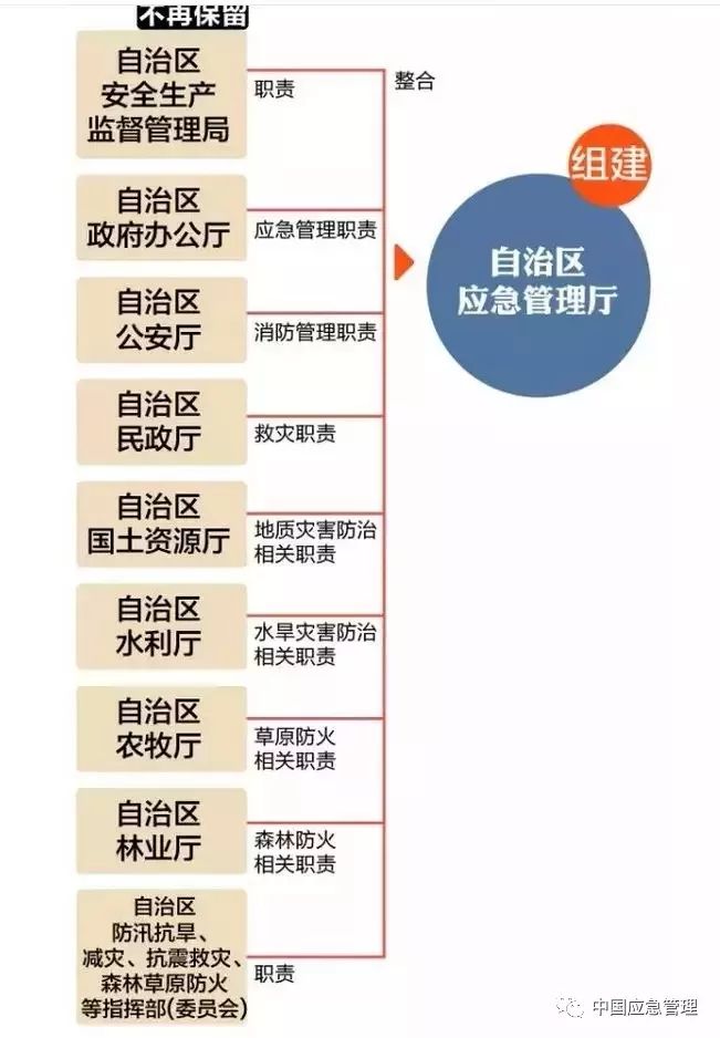 組建自治區(qū)應(yīng)急管理廳。為防范化解重特大安全風(fēng)險,整合優(yōu)化應(yīng)急力量和資源,提升防災(zāi)減災(zāi)救災(zāi)能力,將安全生產(chǎn)監(jiān)督管理局和政府辦公廳、公安廳、民政廳、國土資源廳、水利廳、農(nóng)牧廳、林業(yè)廳涉及應(yīng)急管理的職責(zé),以及自治區(qū)防汛抗旱、減災(zāi)、抗震救災(zāi)、森林草原防火等指揮部的職責(zé)整合,組建應(yīng)急管理廳。