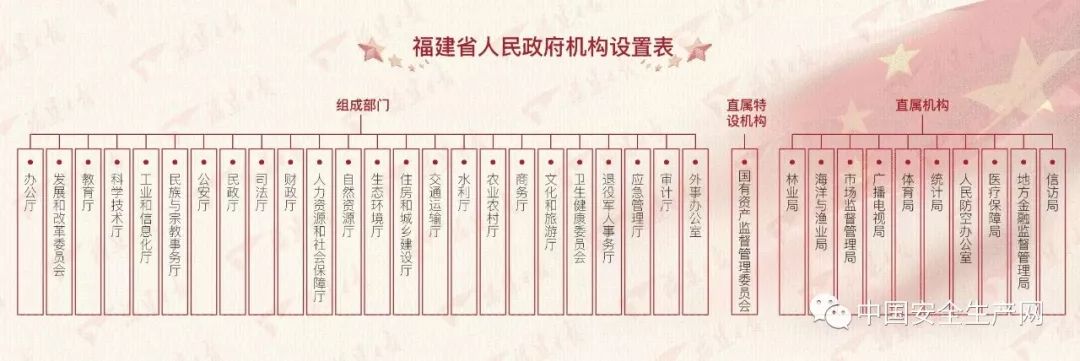《福建省省級機(jī)構(gòu)改革實施方案》明確,福建省省級共設(shè)置黨政機(jī)構(gòu)60個。黨委機(jī)構(gòu)19個,其中,紀(jì)檢監(jiān)察機(jī)關(guān)1個,工作機(jī)關(guān)15個,工作機(jī)關(guān)管理的機(jī)關(guān)3個。政府機(jī)構(gòu)41個,其中,省政府辦公廳和組成部門24個,直屬特設(shè)機(jī)構(gòu)1個,直屬機(jī)構(gòu)10個,部門管理機(jī)構(gòu)6個。