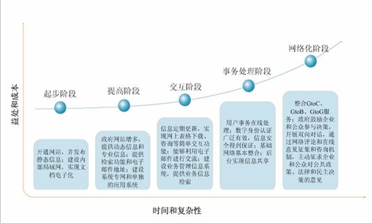 電子政務是一個漸進的發(fā)展過程,其發(fā)展水平是以公共服務的水平為標志,因此也就可以按照公共服務水平的高低劃分電子政務的發(fā)展階段。依照聯(lián)合國的研究報告,電子政務的發(fā)展階段共包括五個階段,由低到高分別是:起步階段、提高階段、交互階段、事務處理階段和網(wǎng)絡化階段(詳見圖2)。需要強調(diào)的是,這些階段并不是相互獨立的,并沒有明確的劃分界線。