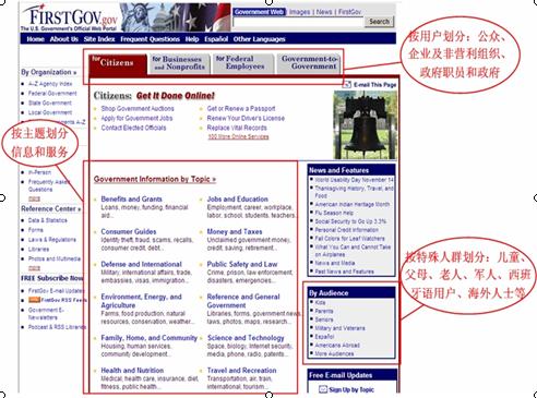 美國“第一政府”門戶網(wǎng)站是世界上最早建立的政府門戶網(wǎng)站之一,也是世界上功能最完善、服務最豐富的政府門戶網(wǎng)站之一?!暗谝徽遍T戶網(wǎng)站的設計較好地體現(xiàn)了“以公眾為中心”這一理念(詳見圖4)?!暗谝徽笔醉撋险紦?jù)面積最大的不是政府新聞,而是關(guān)于公共服務的鏈接和指示。按不同的用戶群將服務劃分為四類:針對公眾的、針對企業(yè)及非營利機構(gòu)的、針對聯(lián)邦政府職員的和針對政府部門的。用戶可以依照這一分類對號入座。首頁右側(cè),為特殊人群開設了專門的服務通道,這些特殊人群分別是兒童、父母、老人、軍人、西班牙語用戶和海外人士。首頁的正中則依據(jù)主體對政府信息和服務進行了劃分,包括福利和救助、就業(yè)和教育、消費者指導、金融和繳稅等。通過這樣的設計,用戶可以不費力氣地找到自己所需的服務。美國政府要求,網(wǎng)站的設計要使得用戶最多點擊三次鼠標就能找到所需服務,這正是“以公眾為中心”這一理念的真正體現(xiàn)。