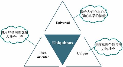 這里主要介紹“u-Japan”中對于“無處不在”的論述。“u-Japan”中的理念可以概括為1個大“U”和3個小“U”。大“U”,即無處不在(Ubiquitous),其核心是基礎(chǔ)設施建設,通過技術(shù)發(fā)展引導和帶動基礎(chǔ)設施建設,并以泛在基礎(chǔ)設施環(huán)境連接所有的人和物,構(gòu)筑任何時間、任何地點、任何人都可以方便地上網(wǎng)辦理任何事務的環(huán)境。第一個小“U”,即大眾普及(universal),主張通過推廣普及性的設計理念,實現(xiàn)普遍服務。第二個小“U”,即用戶導向(user-oriented),主張通過貫徹“用戶至上”的觀點,實現(xiàn)“用戶導向融合型社會”。第三個小“U”,即獨具特色(unique),主張通過充分發(fā)揮信息技術(shù)的潛力,培育充滿個性與活力的社會(詳見圖5)。