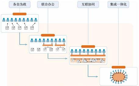 這一理念代表了我們所理解的電子政務公共服務發(fā)展的高級境界。在服務的前臺,公眾獲得的是“集成的服務”,即公眾可以通過統(tǒng)一的渠道和界面獲得公共服務;在服務的后臺,服務的提供是跨越部門界限的,是能夠協(xié)同辦公的。因而,“集成的政府”是在實現(xiàn)了政府互聯(lián)以及服務集成之后的新超越?!凹傻恼边@一理念的提出,標志著以新加坡為代表的電子政務領(lǐng)先國家的電子政務建設重點正在從前臺向后臺轉(zhuǎn)移。通過圖8能更好地理解“集成的政府”所蘊含的政府公共服務提供方式的變化。