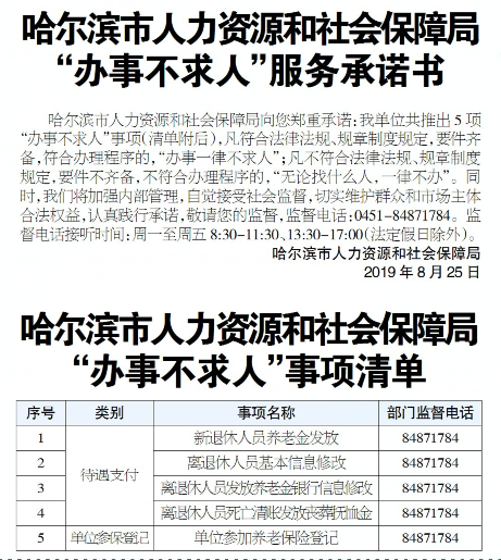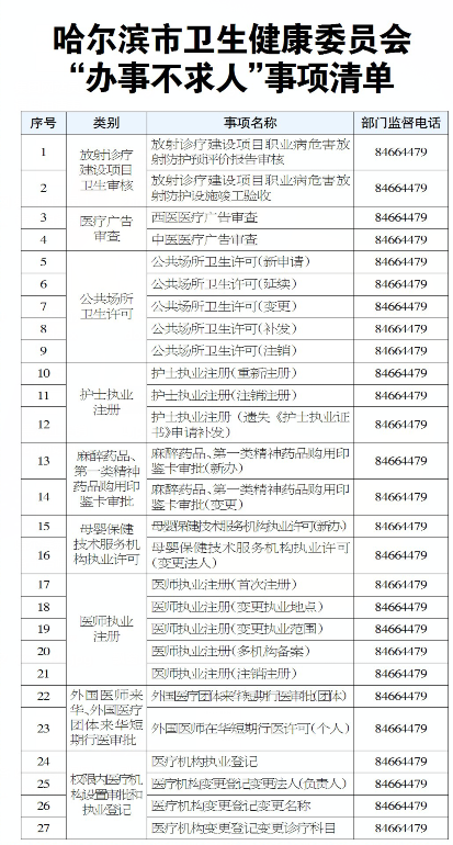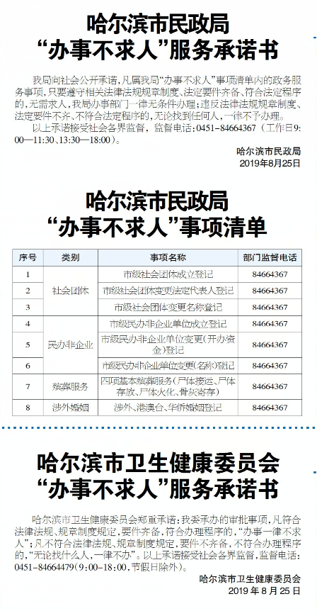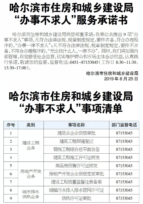 為貫徹落實(shí)省政府工作報(bào)告提出的“辦事不求人”要求,切實(shí)解決群眾、市場(chǎng)主體在日常生活和生產(chǎn)經(jīng)營(yíng)中遇到的辦事求人問題。哈爾濱市市場(chǎng)監(jiān)督管理局、哈爾濱市民政局、哈爾濱市衛(wèi)生健康委員會(huì)、哈爾濱市人力資源和社會(huì)保障局、哈爾濱市住房和城鄉(xiāng)建設(shè)局、哈爾濱住房公積金管理中心6家單位梳理了第二批市級(jí)“辦事不求人”事項(xiàng)清單共計(jì)100項(xiàng),現(xiàn)予以公布?!稗k事不求人”事項(xiàng)清單實(shí)行動(dòng)態(tài)管理,根據(jù)法律、法規(guī)、規(guī)章等辦事依據(jù)變化情況,及時(shí)對(duì)事項(xiàng)進(jìn)行調(diào)整和完善。“辦事不求人”事項(xiàng)清單將分批次對(duì)外公布,最終實(shí)現(xiàn)全覆蓋。清單中所列事項(xiàng)辦事指南可在哈爾濱政務(wù)服務(wù)網(wǎng)(http://zwfw.harbin.gov.cn),部門網(wǎng)站及各單位對(duì)外辦事窗口進(jìn)行查詢。歡迎社會(huì)各界對(duì)“辦事不求人”工作建言獻(xiàn)策,各單位將自覺主動(dòng)接受監(jiān)督,對(duì)違諾失信行為將嚴(yán)肅追究相關(guān)人員責(zé)任。全市統(tǒng)一監(jiān)督投訴電話:0451-12388。