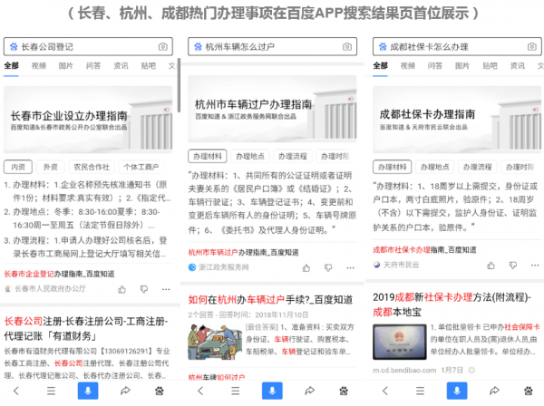 目前,“百度政務(wù)千城計(jì)劃”已觸達(dá)包括北京市、浙江省全省11個(gè)地級市,以及省會城市長春、成都、昆明等在內(nèi)的幾十個(gè)地方政府,完成了多地政府在百度知道上政策信息、辦事信息、政務(wù)服務(wù)的內(nèi)容布局。個(gè)人和企業(yè)用戶可通過百度APP搜索政務(wù)辦事的相關(guān)信息,直接獲取由市政府或相關(guān)政務(wù)中心提供的服務(wù),及時(shí)有效地完成信息查詢、事項(xiàng)辦理。