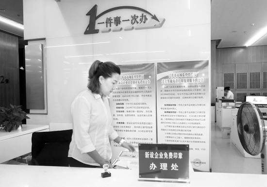 8月28日,寧鄉(xiāng)市市民之家,工作人員在新設(shè)企業(yè)免費(fèi)印章辦理處忙碌。從今年7月1日起,寧鄉(xiāng)市實行新設(shè)企業(yè)首套印章免費(fèi)制度。圖/王嬌嬌