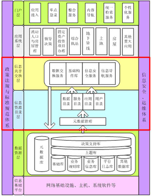電子政務總體技術框架如圖所示,包括了信息基礎平臺層、數(shù)據(jù)資源層、信息資源目錄層、信息資源共享交換層、應用系統(tǒng)層和門戶層等多個層次,以及信息安全、政策法規(guī)與標準規(guī)范兩大保障體系。