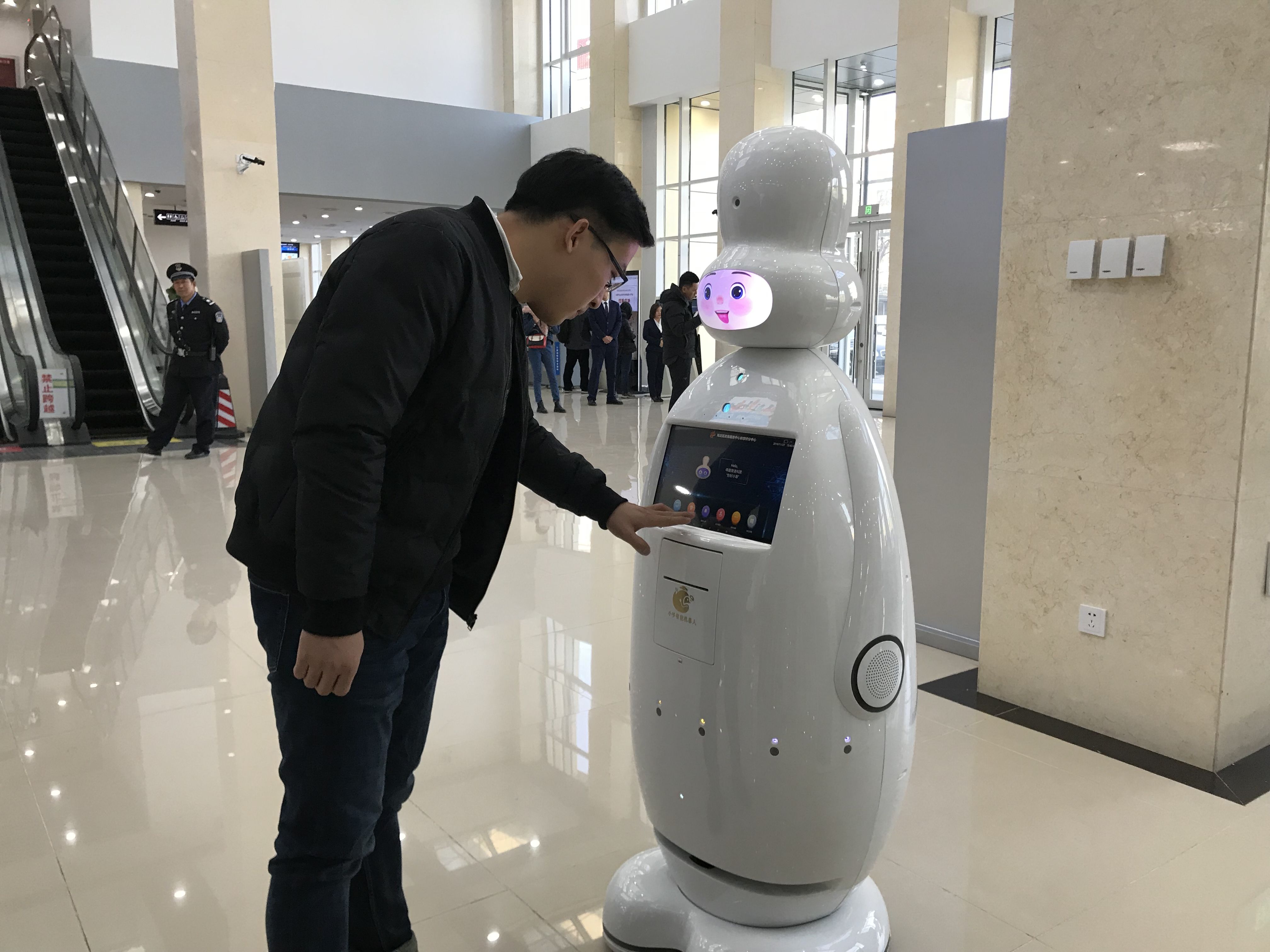 新政務(wù)服務(wù)大廳設(shè)置的可移動機器人。攝/新京報記者 陳琳
