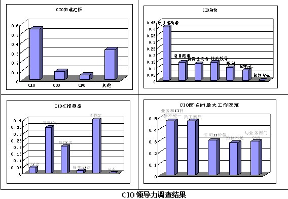 《信息周刊》最近對中國CIO領(lǐng)導(dǎo)力進(jìn)行了調(diào)查,調(diào)查結(jié)果顯示:45%的中國CIO直接向總裁或CEO匯報工作,而其他CIO向COO、CFO或者其他高級經(jīng)理層匯報;只有8%的CIO在組織中扮演著組織戰(zhàn)略家的角色,大多(41%)CIO還只是扮演著項目推動者的角色;只有38%的CIO至少每周向直接主管匯報,而多達(dá)40%的CIO沒有固定時間向主管匯報;將近一半(47%)的CIO任務(wù)自己最大的困難是業(yè)務(wù)目標(biāo)和IT項目間缺乏統(tǒng)一性和員工素質(zhì)和能力有待提高。(信息周刊 2006)