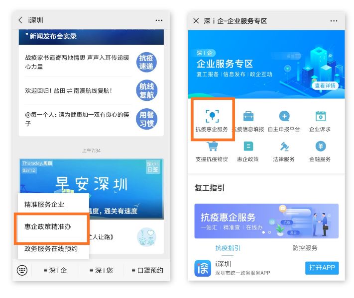 渠道二 “i深圳”APP“深i企-企業(yè)服務(wù)”專區(qū)點擊“抗疫惠企服務(wù)”。