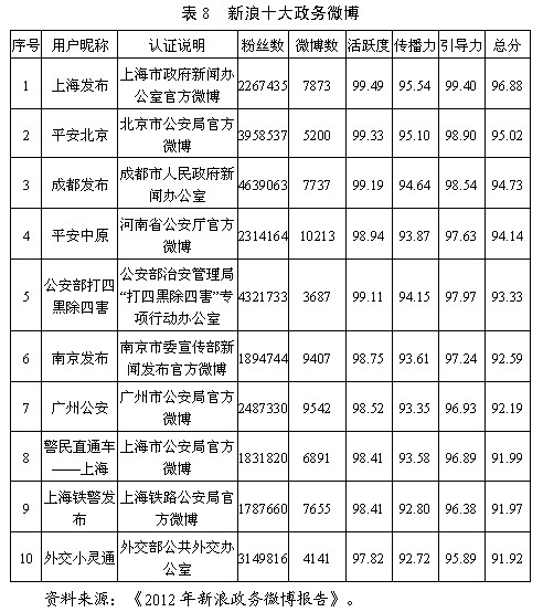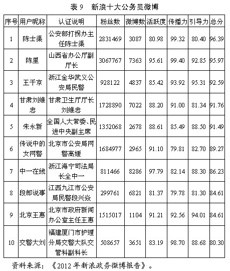 1.政務(wù)微博數(shù)量大、發(fā)展速度快。根據(jù)新浪微博聯(lián)合國內(nèi)知名網(wǎng)絡(luò)輿情研究機(jī)構(gòu)人民網(wǎng)輿情監(jiān)測室共同發(fā)布《2012年新浪政務(wù)微博報告》顯示,截至2012年10月底,新浪微博認(rèn)證的政務(wù)微博總數(shù)達(dá)到60064個,相比去年同期凈增41932個,增長率達(dá)231%。目前,新浪政務(wù)微博的發(fā)博總數(shù)約為3200萬條,平均每個政務(wù)微博的發(fā)博數(shù)為531條。從地域分布看,江蘇省政務(wù)微博總數(shù)超過6000個,位居全國首位,也是全國唯一一個政務(wù)微博數(shù)突破6000的省份。全國十大政務(wù)微博和十大公務(wù)員微博見表8、表9。