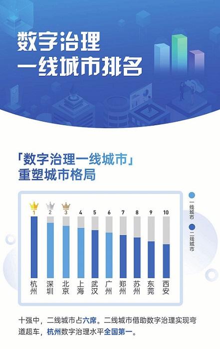 《報告》從數(shù)字基礎(chǔ)設(shè)施、數(shù)字行政服務(wù)、數(shù)字公共服務(wù)和數(shù)字生活服務(wù)四個維度,對2019年度GDP排名前100位的城市數(shù)字治理水平進(jìn)行了研究分析,杭州、深圳、北京、上海、武漢、廣州、鄭州、蘇州、東莞和西安位列前十。研究顯示,杭州的數(shù)字行政服務(wù)、數(shù)字公共服務(wù)和數(shù)字生活服務(wù)等單項(xiàng)指標(biāo)全面領(lǐng)先,總指數(shù)排名超越四大傳統(tǒng)一線城市,位列全國第一。在針對45個城市居民的數(shù)字生活滿意度問卷調(diào)查中,杭州市民的數(shù)字生活滿意度也同樣最高。