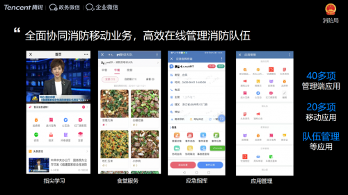 此外,政務(wù)微信延續(xù)微信開(kāi)放平臺(tái)體系,提供了豐富的服務(wù)端應(yīng)用以及終端能力的API。某地消防局便通過(guò)豐富的API接口將應(yīng)急指揮、食堂服務(wù)、培訓(xùn)學(xué)習(xí)等功能集成在政務(wù)微信上,打造了一個(gè)消防管理應(yīng)用集成平臺(tái)。