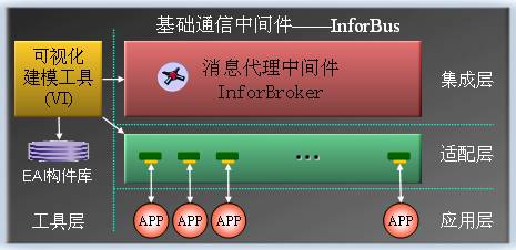 InforEAI,建立在基礎通信中間件InforBus(CORBA ORB)之上;內置消息代理中間件InforBroker提供XML的消息總線服務和集線器(Hub)式的集成服務;采用可視化的構件協同建模工具(VI),通過直觀拖放構件來組裝與配置應用適配器;通過管理工具,實現適配器的遠程部署和管理。
