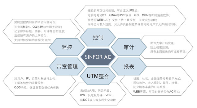作為一個UTM整合式設備,SINFOR AC上網(wǎng)行為管理設備還集成了:防火墻、網(wǎng)關殺毒、IPS、VPN、反垃圾郵件等多種安全功能。SINFOR AC上網(wǎng)行為設備從內(nèi)到外、全方位一體化,保護企業(yè)網(wǎng)絡的整體安全。SINFOR AC上網(wǎng)行為管理設備,能夠幫助您的企業(yè):提高員工工作效率、降低企業(yè)泄密風險、減少企業(yè)法律責任、保護企業(yè)內(nèi)外網(wǎng)絡整體安全。