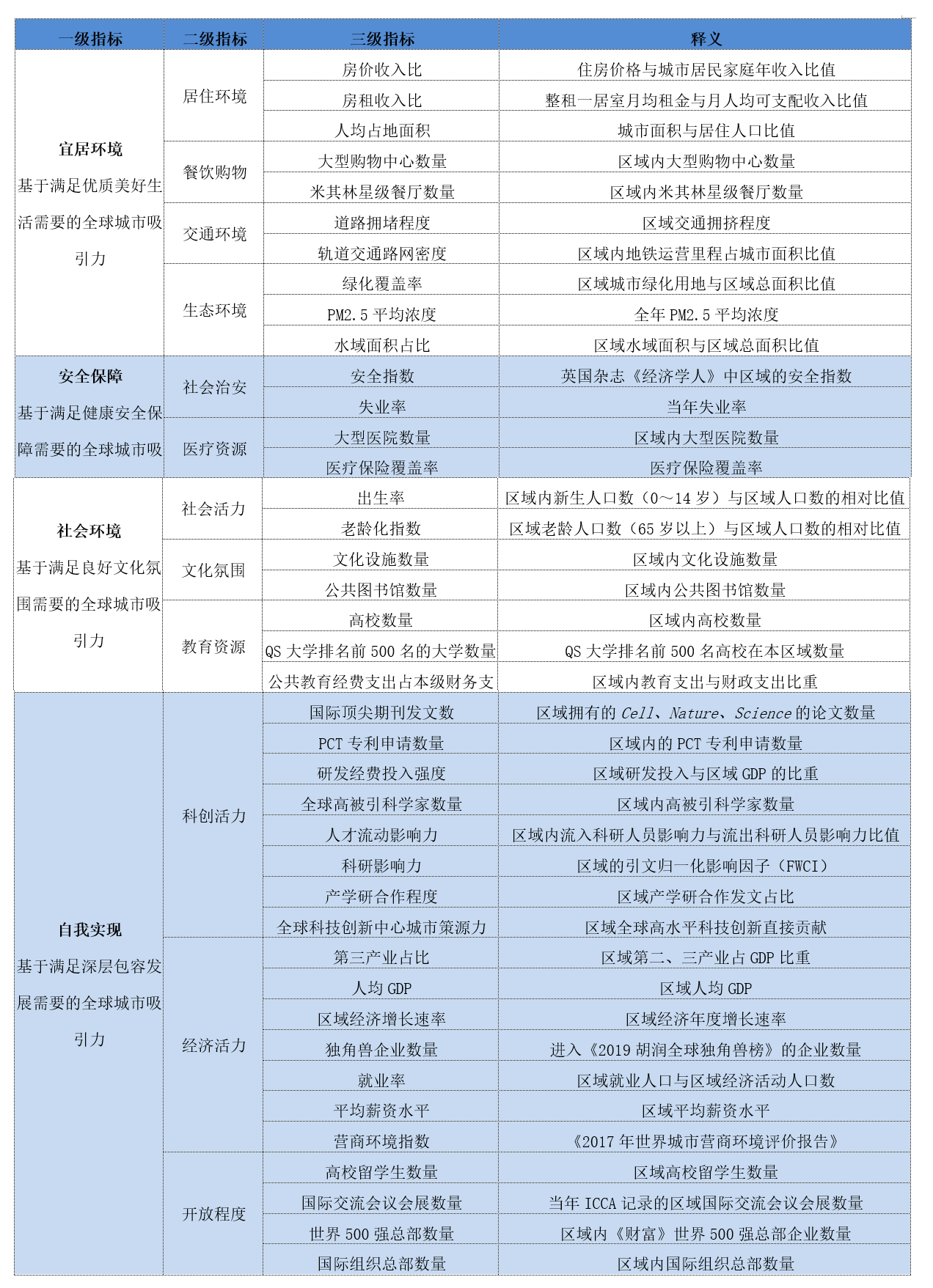當(dāng)前,無(wú)論是國(guó)家對(duì)上海的戰(zhàn)略要求,還是上海自身的城市規(guī)劃,都將創(chuàng)新擺在首要位置。我們邀請(qǐng)產(chǎn)業(yè)經(jīng)濟(jì)學(xué)、城市研究、政策研究等方面專家進(jìn)行線上咨詢。結(jié)合專家意見及數(shù)據(jù)可獲取性因素,確定全球城市吸引力指標(biāo)體系(表1)。
