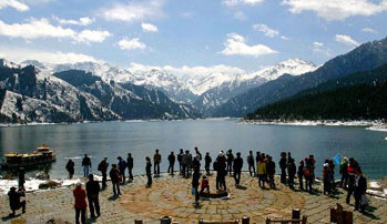 2008年5月2日,新疆天山天池風景區(qū)游人如織。 5月1日晚,新疆天山天池風景區(qū)出現(xiàn)降雪,雪后的天池景區(qū)內(nèi)白雪、蒼松與高山湖泊相映襯,顯得格外動人,吸引眾多游客。 新華社記者王菲攝
