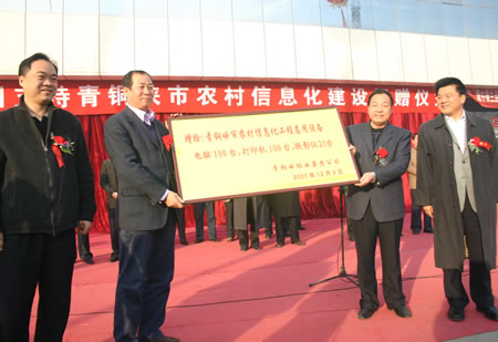 近日,青鋁集團(tuán)支持青銅峽市農(nóng)村信息化建設(shè)捐贈(zèng)儀式在該市中心廣場舉行。在當(dāng)天的捐贈(zèng)儀式上,青鋁集團(tuán)董事長黃河、黨委書記張創(chuàng)奇將價(jià)值80余萬元的電腦、打印機(jī)、投影儀等應(yīng)用設(shè)備交到青銅峽市委書記胡東升、市長高萬金手中。
