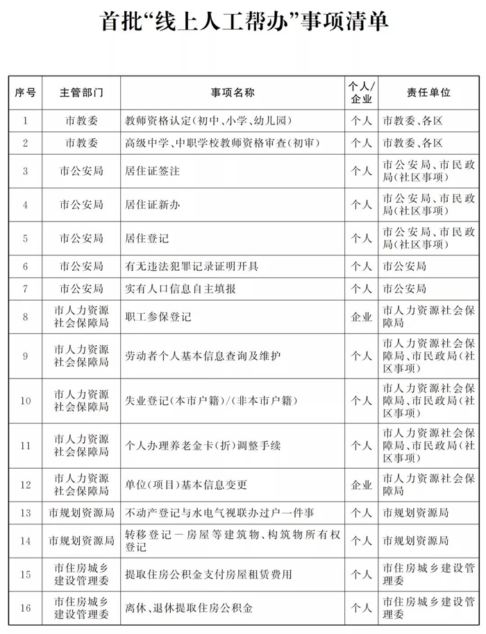 2021年底前,實(shí)現(xiàn)“線上人工幫辦”覆蓋本市辦件量居前的35個(gè)企業(yè)事項(xiàng)和個(gè)人事項(xiàng)。