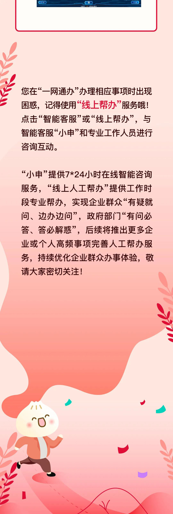 根據(jù)辦理事項(xiàng)和咨詢內(nèi)容,線上幫辦平臺(tái)自動(dòng)轉(zhuǎn)接各有關(guān)單位“線上人工幫辦”,實(shí)現(xiàn)“小申”與“線上人工幫辦”融合互補(bǔ)。