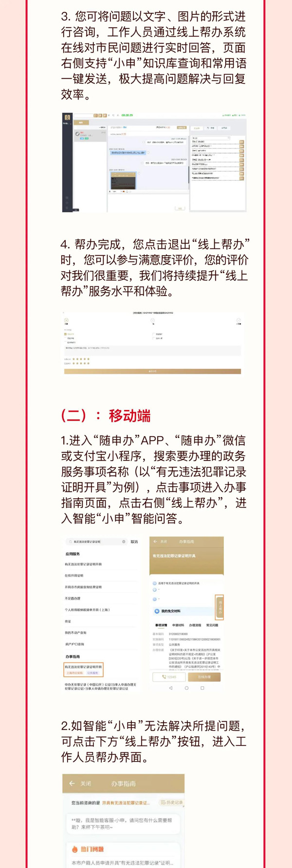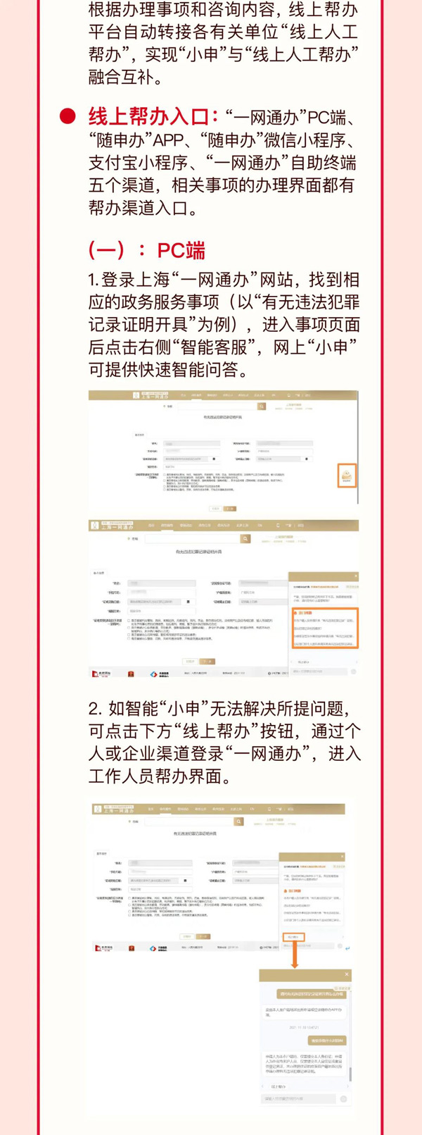 線上幫辦包括三個(gè)服務(wù)渠道。一是電話咨詢,“12345”市民服務(wù)熱線電話和各單位咨詢電話;二是網(wǎng)上“小申”智能客服(以下簡(jiǎn)稱“小申”),依托“一網(wǎng)通辦”知識(shí)庫(kù)提供快速智能問(wèn)答;三是線上人工專業(yè)幫辦(以下簡(jiǎn)稱“線上人工幫辦”),在網(wǎng)上PC端或移動(dòng)端,通過(guò)文字、語(yǔ)音、視頻、截圖、錄音等提供在線交互幫辦服務(wù)。