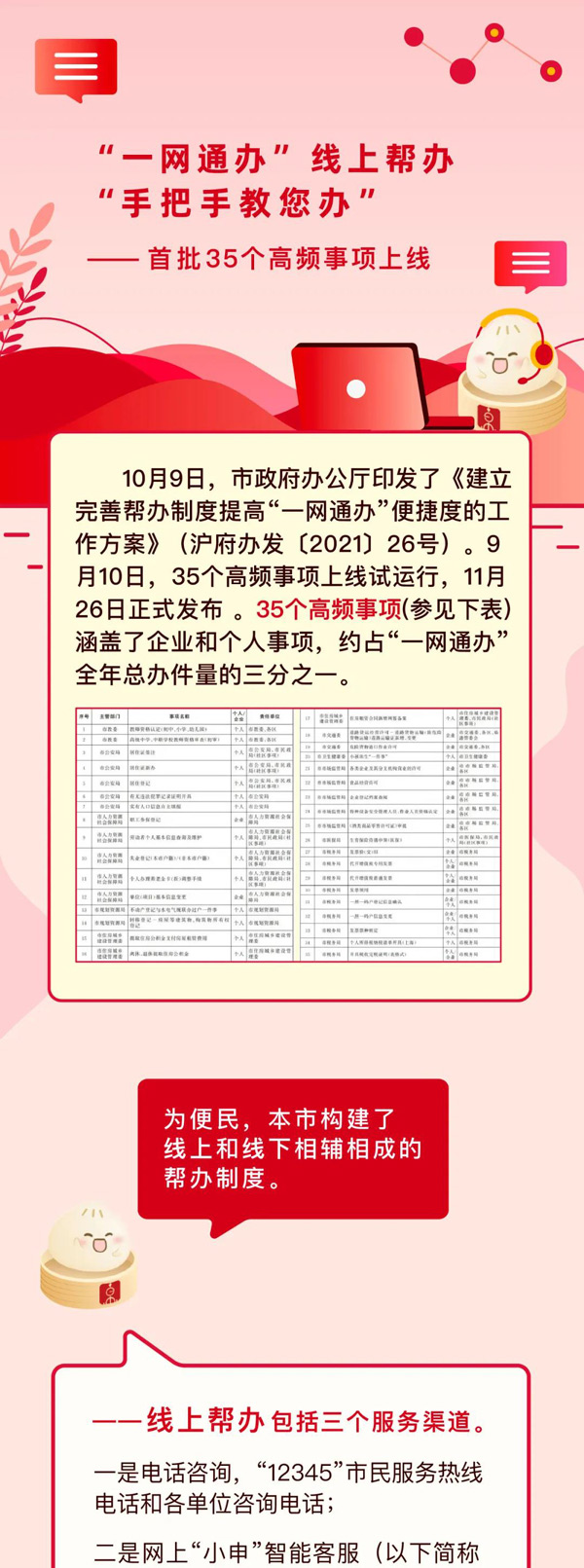 市大數(shù)據(jù)中心介紹,根據(jù)此前印發(fā)的《建立完善幫辦制度提高“一網(wǎng)通辦”便捷度的工作方案》,本市構(gòu)建線上幫辦和線下幫辦相輔相成的幫辦制度。其中,線上幫辦包括三個(gè)服務(wù)渠道,線下幫辦包括兩項(xiàng)機(jī)制。目前,“線上人工幫辦”35個(gè)高頻事項(xiàng)已正式上線,涵蓋企業(yè)和個(gè)人事項(xiàng),年辦件量超2000萬(wàn)件,約占“一網(wǎng)通辦”全年總辦件量的三分之一。