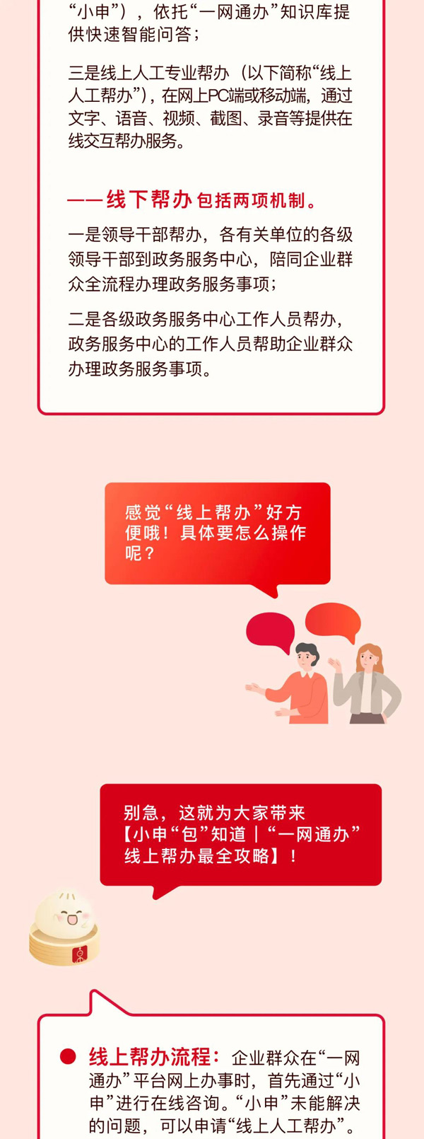 “線上人工幫辦”,主要解決企業(yè)群眾在“一網(wǎng)通辦”辦事過(guò)程中遇到的在線操作、材料準(zhǔn)備、業(yè)務(wù)標(biāo)準(zhǔn)、業(yè)務(wù)流程等方面的專業(yè)問(wèn)題。